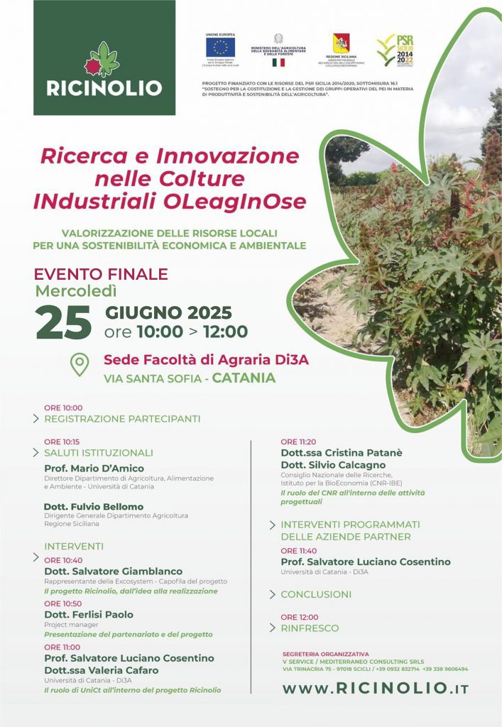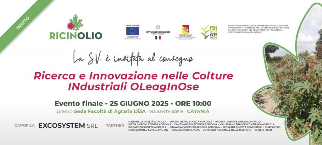 Sede della facoltà di Agraria Di3A – CataniaIl 30 maggio 2024, presso l’Aula Magna del Polo Bioscientifico dell’Università di Catania, si è svolto il Sicilia Innovation Day, evento dedicato al trasferimento delle innovazioni nel settore agricolo, organizzato in collaborazione con il PSR Sicilia. La giornata ha visto la partecipazione di enti di rilievo come il CREA e rappresentanti della Commissione Europea, ed è stata un’occasione di confronto sui temi legati all’innovazione di processo e di prodotto per le filiere agricole e zootecniche. Tra i progetti presenti anche RICINOLIO – Ricerca e innovazione nelle colture industriali oleaginose, finanziato dal PSR Sicilia 2014-2020, Sottomisura 16.1. Il progetto, coordinato da Excosystem Srl in collaborazione con l’Università di Catania, il CNR e diverse aziende agricole partner, punta a valorizzare la coltura del ricino attraverso soluzioni innovative e sostenibili: